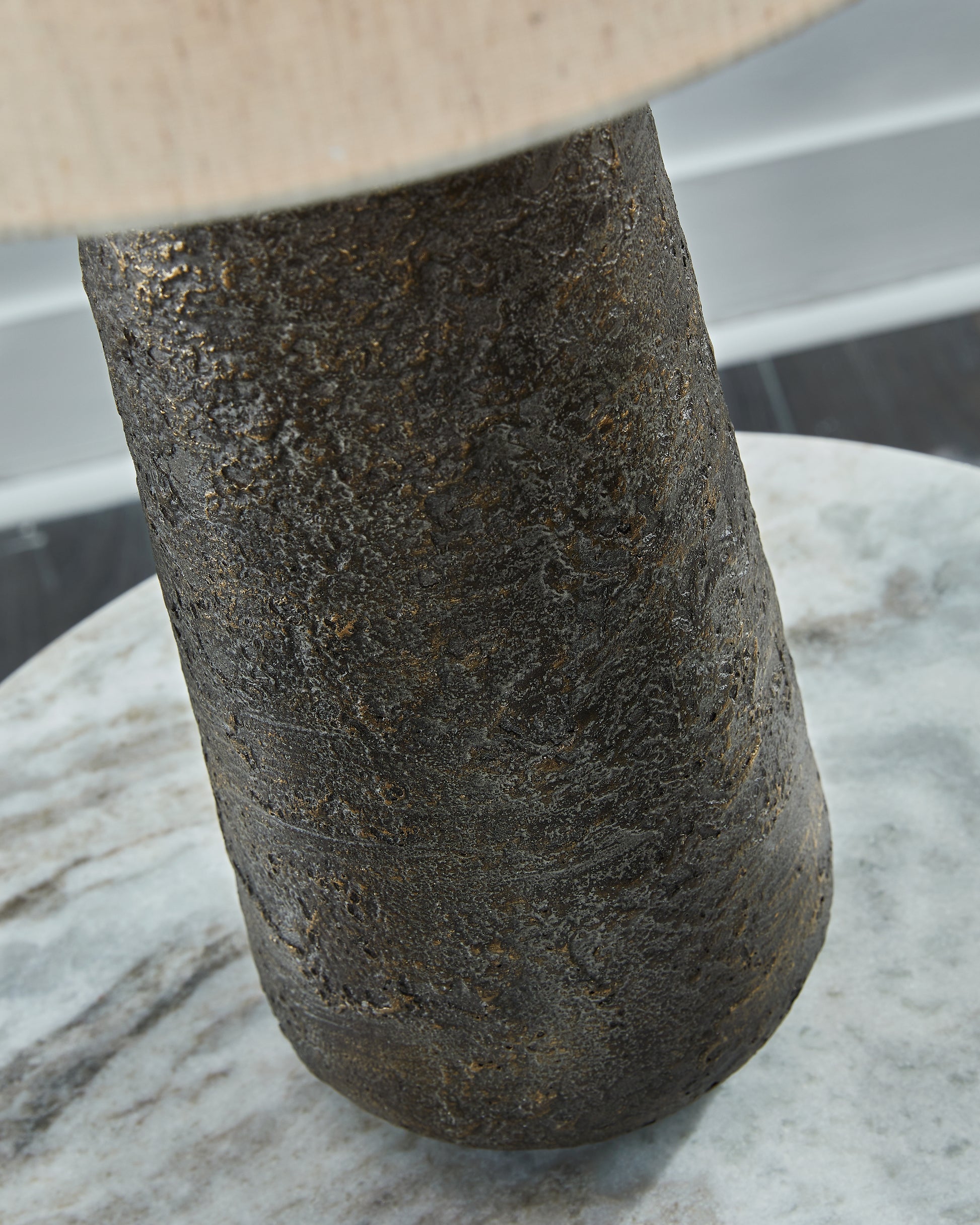 Modern industrial design in a new light. A mixed-media masterpiece, this table lamp provides maximum interest and exceptional versatility with its heavily textured surface. Whether it's resting on your nightstand or on a side table, it delivers a unique aesthetic to your casual space.