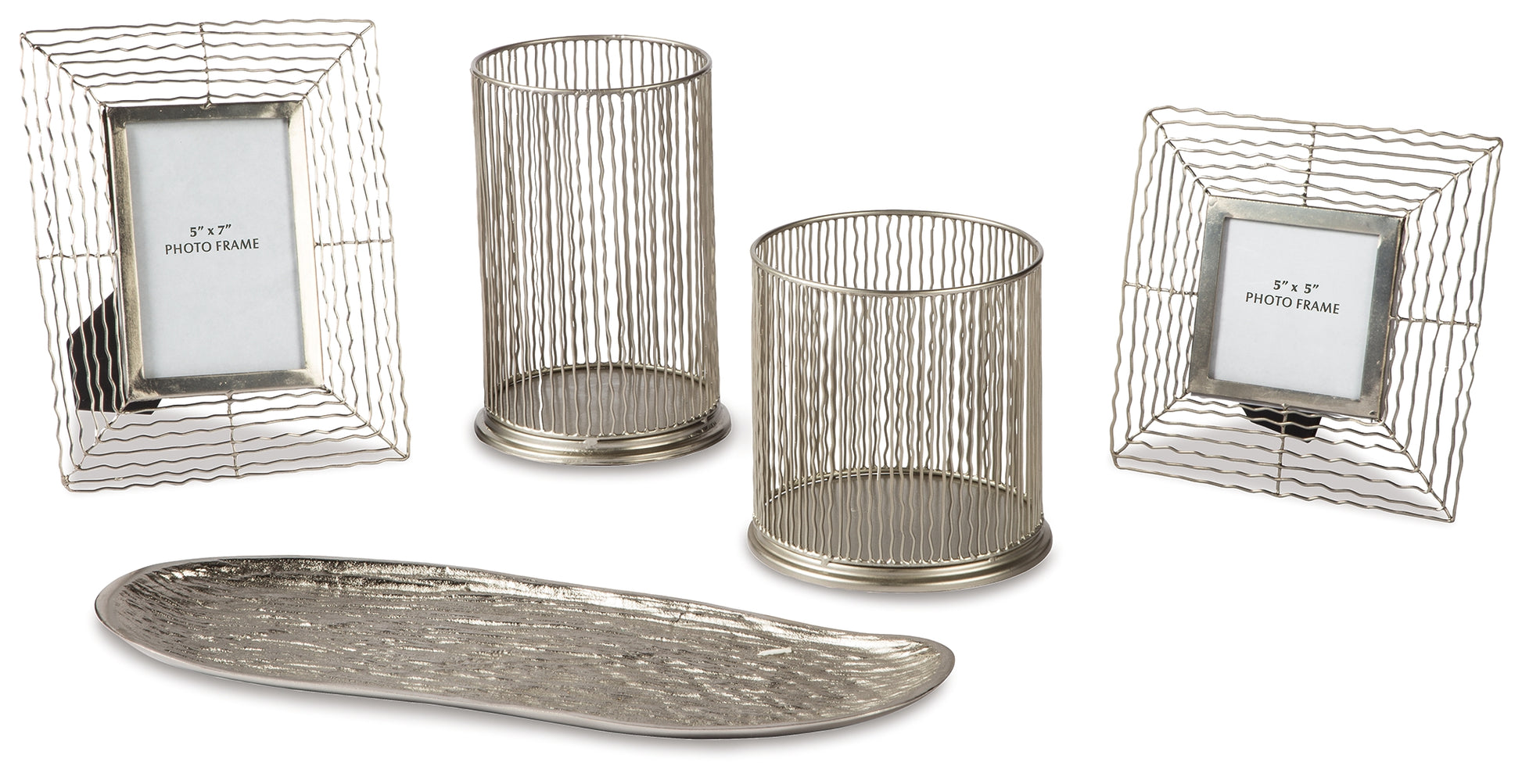 Make some waves with this highly contemporary accessory collection. Wonderfully open and airy, the wavy metal frames and hurricane candle holders beautifully go with the flow. Organic shaped tray is a natural complement.