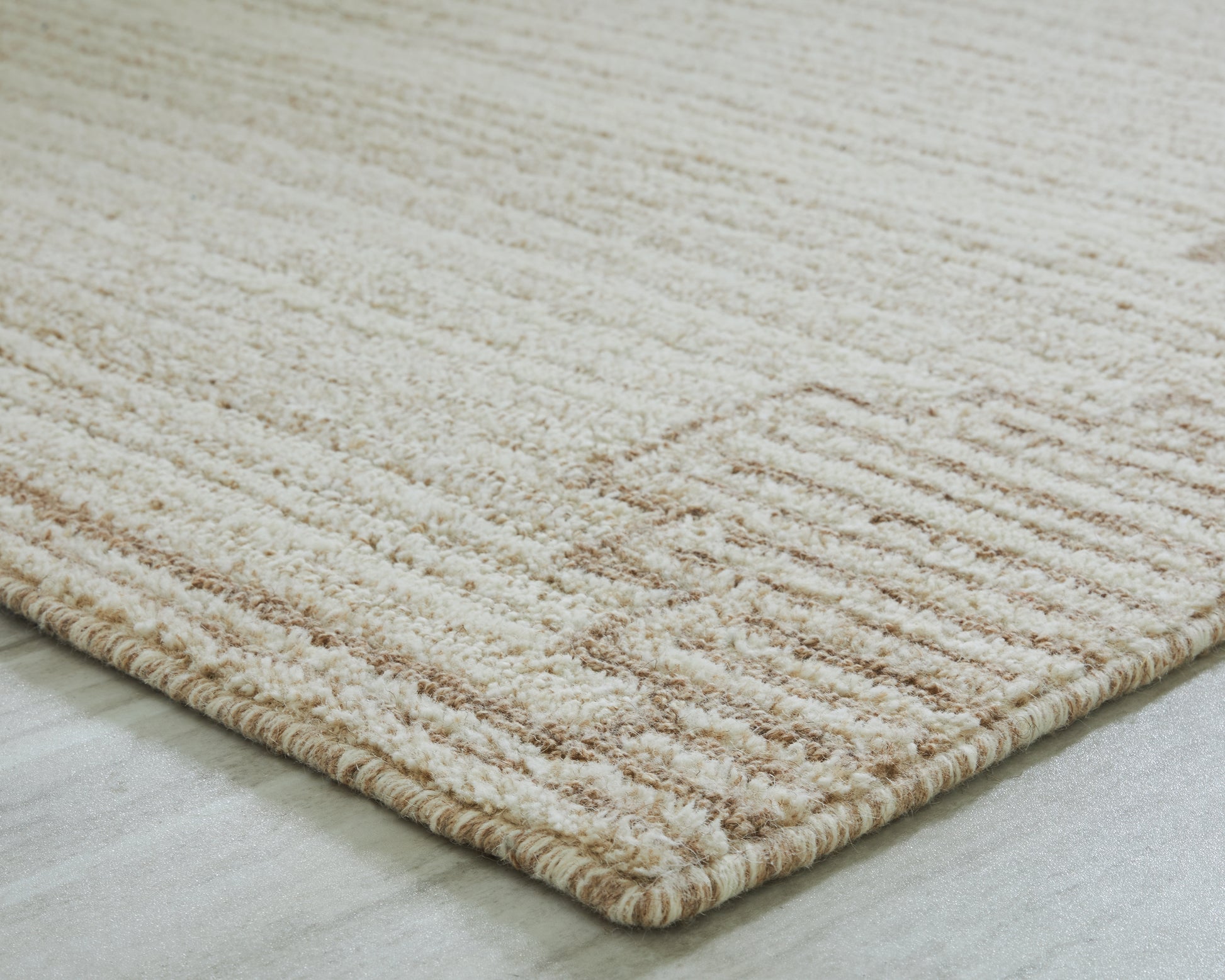 Dress up any floor with the tastefully approachable design of this rug. Its distinctive stepped border pattern, rendered in versatile neutrals, creates a subtly eye-catching look that brings modern elegance to any casual space. Crafted from wool with a generous pile, this rug doesn't just stun with its good looks—it also delivers an indulgent feel underfoot.