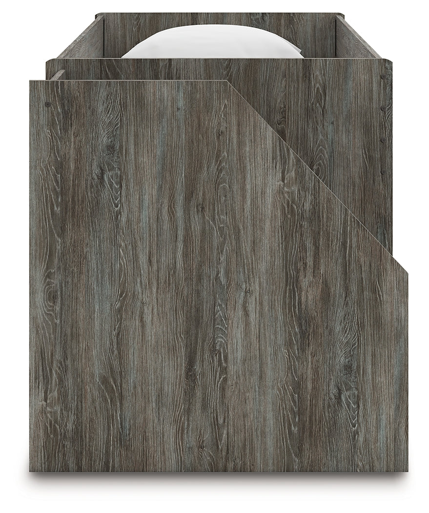 Cool, casual style is for all ages. With this full bookcase panel bed, they get the function they need plus the refined design you love. Approachably neutral in a rustic warm gray, it’s adaptable enough to pair with an assortment of existing colors and room decor. Faux metal detailing with nailhead accents lends an industrial edge. And handy storage cubbies in the headboard keep books, toys and other bedtime necessities within easy reach.
