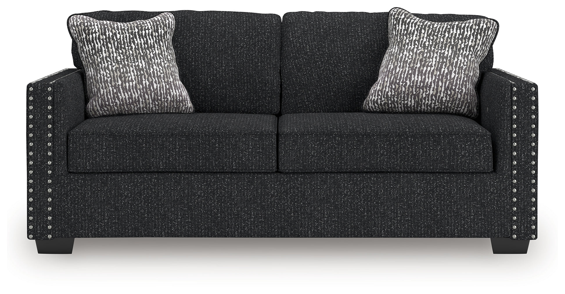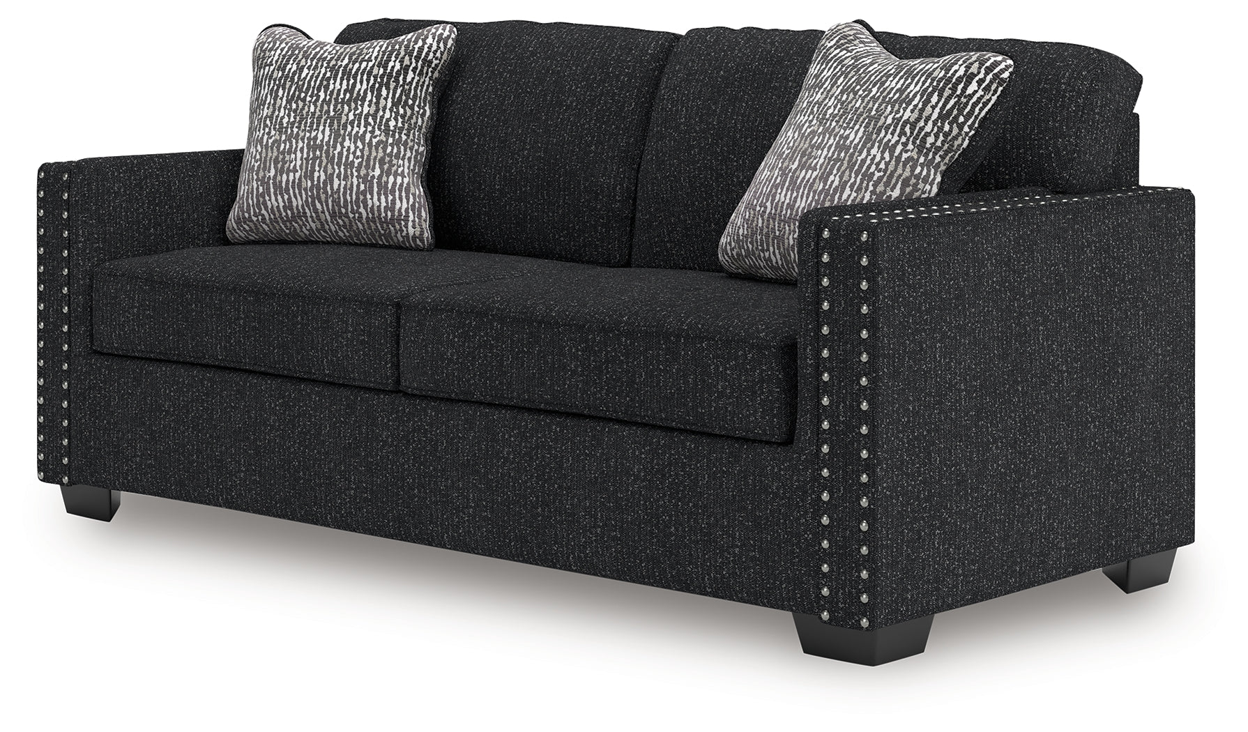 This stunning sofa leaves a lasting impression. Its cozy cushions, chic coal-colored upholstery and striking nailhead trim are a perfect blend of comfort and contemporary design. And here’s the showstopper—ambient red, white and blue LED lighting along the sofa's base. The look is simply wow.