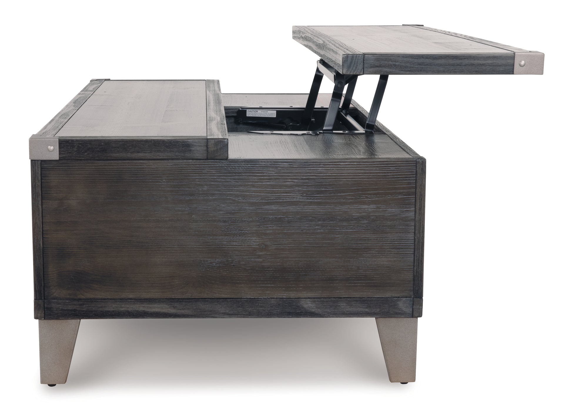 Mixed material lift top table truly elevates rustic-industrial style. Weather-washed pine wood and veneers are contrasted with canted metal legs and corner bracket accents for a uniquely chic merger of earthy beauty and contemporary flair. A handy spring-loaded mechanism brings the tabletop to you, while two drawers with removable storage trays are packed with possibilities.