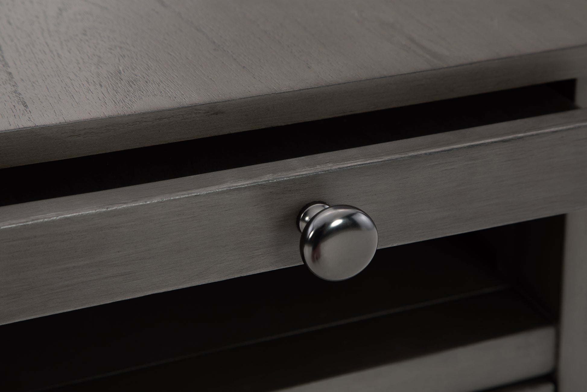 - Table features storage cabinet, open cubby shelf and pull-out tray
