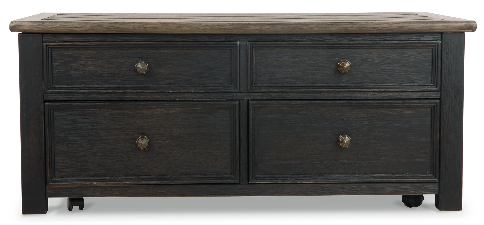 Shabby chic with a hint of down-home country, this lift-top coffee table is all the talk of today’s design world. Wood grain shows through the weathered gray-brown top in all of its earthy pleasure. The framed drawers, adorned with lovely traditional hardware, make it easy for you to store your belongings in style. And the table's lift top transforms your space into a workstation without a hitch.